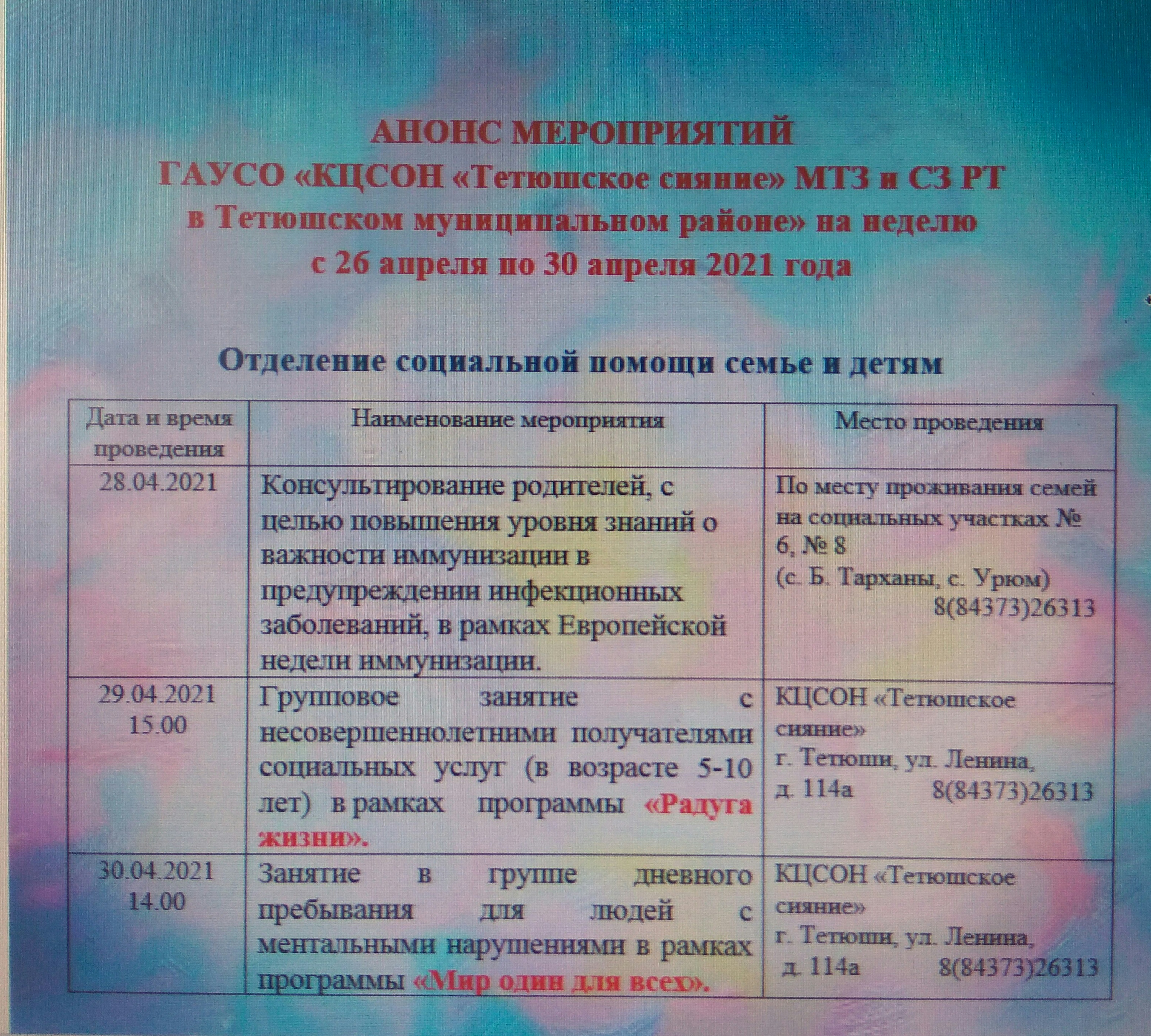 Мероприятия отделения социальной помощи семье и детям с 26 апреля по 30 апреля 2021 года
