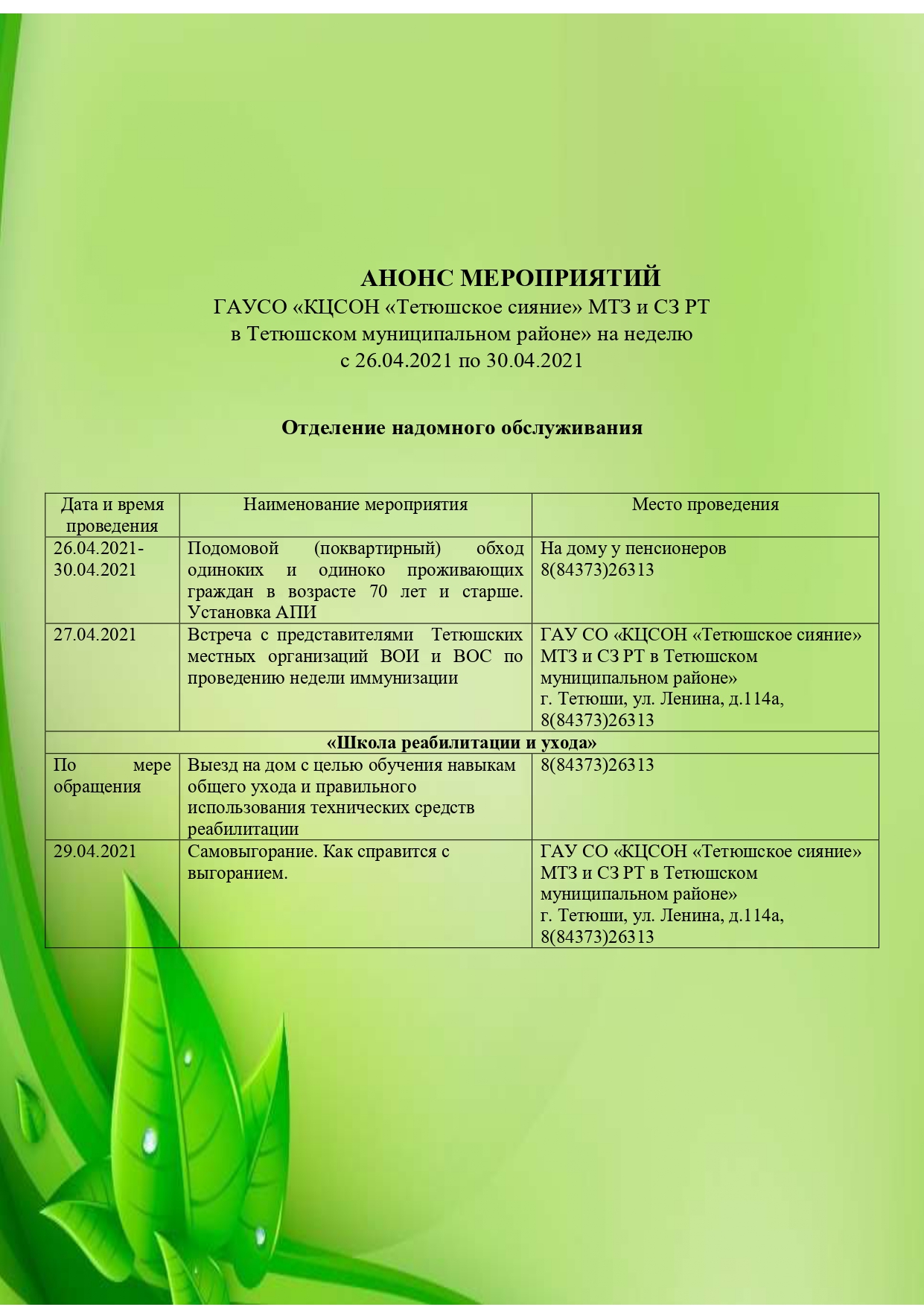 Мероприятия отделения надомного обслуживания с 26 апреля по 30.апреля .2021 года