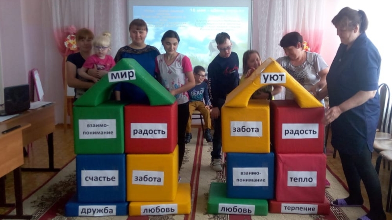 Каждой семье-команде было предложено построить дом своей мечты с помощью кирпичиков- модулей: кирпич «здоровья», «уважения», «любви», кирпич «мира и добра» и др. У команд «Дружба» и «Любовь» получились очень крепкие и основательные дома. После окончания «стройки» родители возле своих домов посадили дерево, повесили на него листочки с чертами характера или качеством, которыми они бы хотели наделить своих детей. Дерево у каждой команды получилось волшебное, и все пожелания родителей обязательно должны исполниться.