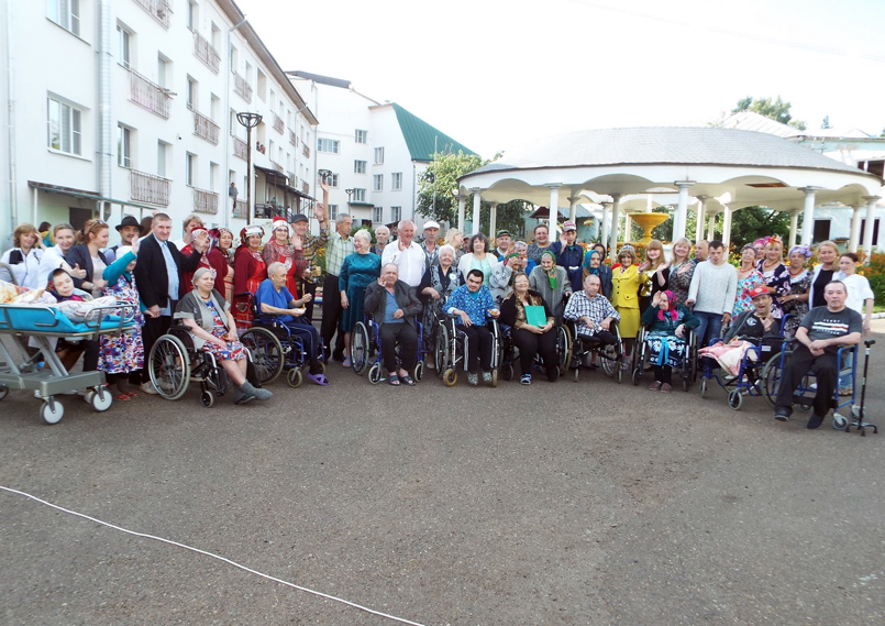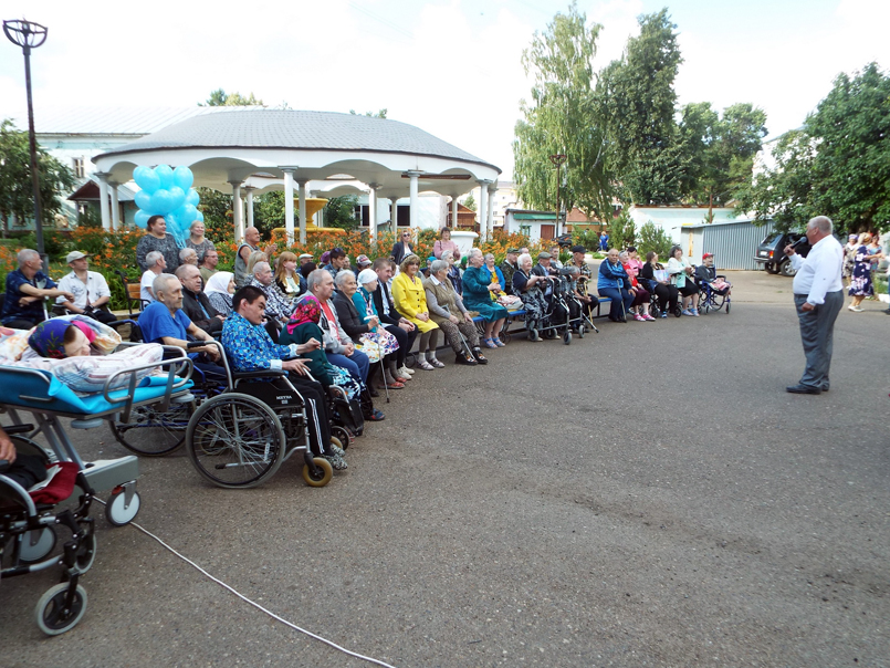 Мероприятие прошло на свежем воздухе, во дворе интернате на площадке перед фонтаном. В этот летний день десятки пожилых людей стали и зрителями, и участниками большого праздничного концерта.