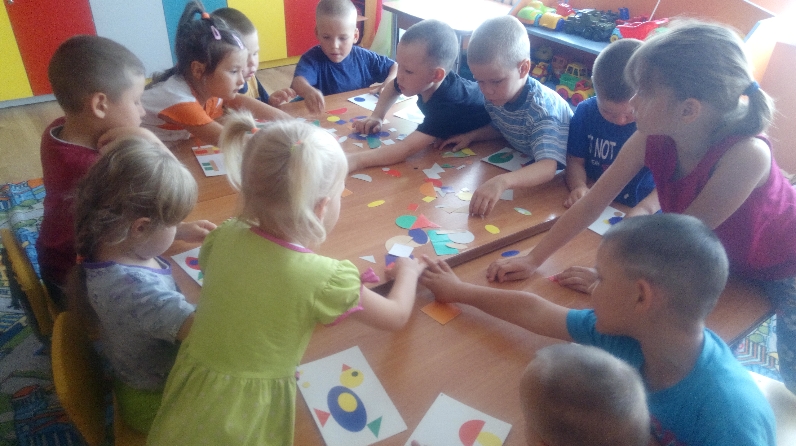 Ребята посмотрели мультфильм про волшебные геометрические фигуры, которые превращались в живых веселых животных: собачку, цыпленка, кошечку, мышонка. Поиграли в настольные игры «Цветные фигурки» и «Составь картинку из фигур». В ходе игр уточнили названия фигур, а так же цвета спектра. Ребята с заданиями справились, проявили память, мышление и сообразительность.