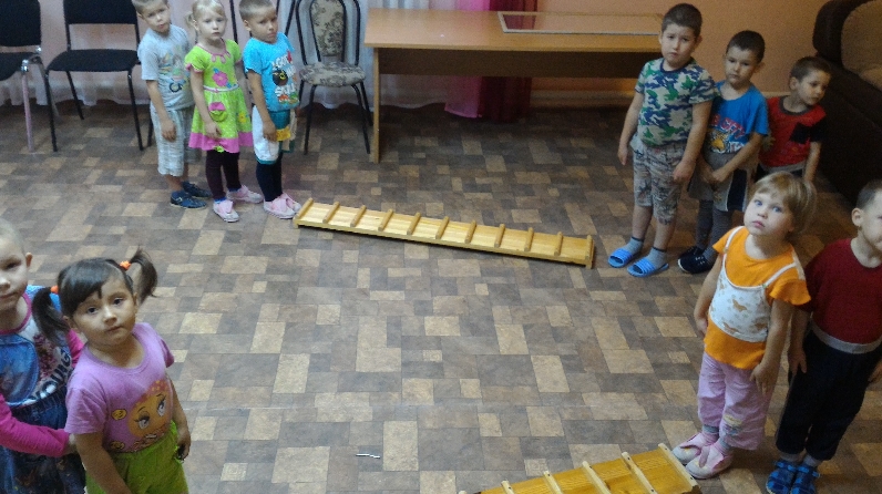 Перед началом игры «На мостике» дети познакомились с правилами ее проведения. Далее воспитанники разделились на две группы и заняли свои места перед мостиками через пропасть. По сигналу воспитателя с каждой стороны навстречу друг к другу одновременно по нему шли по одному игроку, чтобы он не перевернулся, а остальные активно их поддерживали. Приступив к выполнению задания, участники договаривались о темпе движения, старались следить за синхронностью, а при встрече на середине мостика — аккуратно менялись местами и проходили до конца. Выигрывала та команда, которая благополучно и без потерь перебиралась по мостику с одной стороны пропасти на другую.