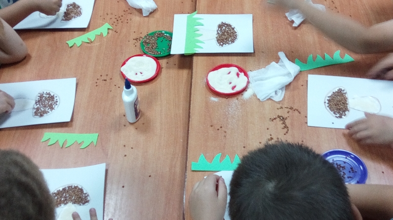 После чего приступили к практической части – изготовление аппликации из крупы, в ходе которой дети на шаблон гриба наносили клей, шляпку гриба выкладывали из гречневой крупы, а ножку – манной крупой.
