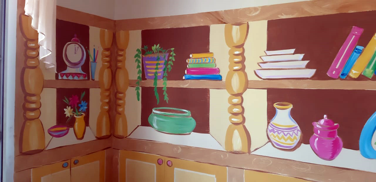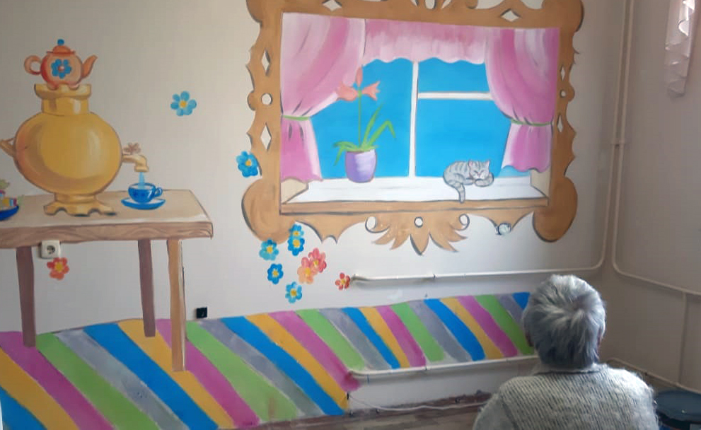 В силу особенностей заболевания престарелым людям с деменцией особо важна организация пространства помещения, стимулирующего у пожилых людей положительные эмоции, без опасных поверхностей и мебели. Идея создания нарисованного интерьера реализована при поддержке МБУ «Детская художественная школа № 2» (г. Елабуга).