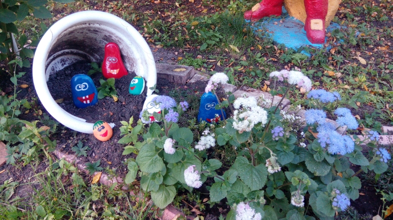 Перед тем как оформлять клумбы камнями участники занятия подготовили клумбы: пропололи их от сорняков и прорыхлили землю, обработали цветы от различных паразитов. Для оформления клумбы были приготовлены разрисованные на прошлых занятиях камни. Внутри, среди цветов, участницы занятия установили фигурки «божьих коровок» и смешных человечков. Результаты работы понравились всем участникам занятия, женщины захотели попробовать использовать данную идею на собственных дачных участках.