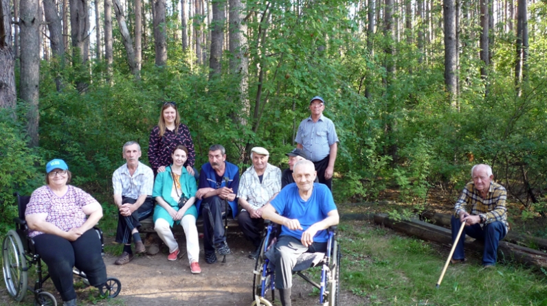 Прекрасная асфальтированная дорога среди лесного массива позволила совершить прогулку и маломобильным проживающим. Чудесная погода, свежий воздух, многоголосье птиц, хорошая компания – что еще нужно для счастья.