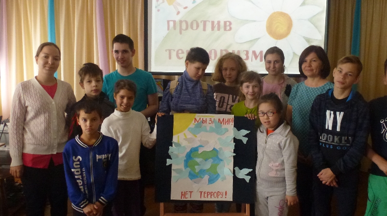 В рамках проведения месячника «Экстремизму – нет!» в Набережночелнинском реабилитационном центре для детей и подростков с ограниченными возможностями «Солнышко» для воспитанников старшего возраста в актовом зале 5 сентября с целью формирования у детей представления о терроризме, как масштабном бедствии всех народов и его последствиях, воспитатели Трофимова А.М., Гарипова Р.Ш. провели познавательно-развивающее мероприятие под названием «Терроризму – нет», где приняли участие 18 реабилитантов. Они познакомились с лексическим значением слова «террор», узнали кто такие террористы и что такое терроризм. Вспомнили о самых страшных злодеяниях, которые были совершены этими людьми за последние годы. В ходе беседы воспитатели Центра акцентировали внимание на необходимости проявления бдительности детей, когда они находятся в местах массового скопления людей и в общественном транспорте. Затем ребята просмотрели ролики, в которых в простой и доступной для детской аудитории форме рассказывается об этой совсем не детской проблеме всего мира, людей всех национальностей, стран и континентов. А в заключении с привлечение всех присутствующих был нарисован плакат со словами «Мы против террора!», где «земной шар» украшали голуби, изготовленные руками девчонок и мальчишек. Мероприятие закончилось исполнением всем хорошо известной песни «Солнечный круг», которую спели дети, взявшись за руки.