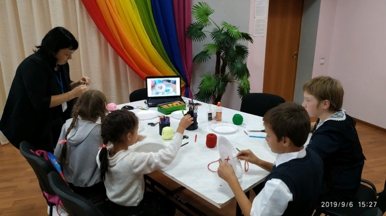 Вначале был проведен небольшой инструктаж о правилах безопасности в ходе работы с ножницами и иголками. Далее было проведено увлекательное практическое творческое занятие, на котором ребята своими руками украсили тарелки из подручных материалов.