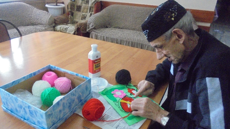 На занятиях получатели социальных услуг применяют нитки для вязания при оформлении рисунка.