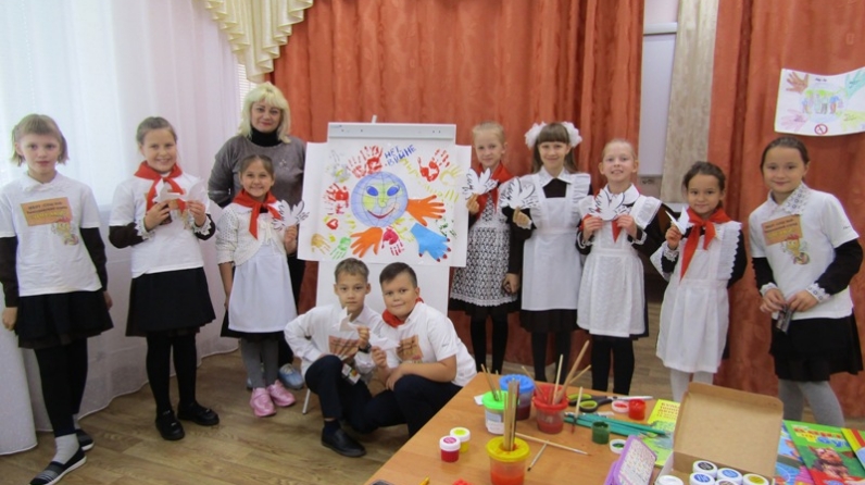 Тимуровцы декламировали стихотворения о мире, дружбе, доброте, об уважении друг друга, отметили, что они за мирное небо над землей и счастливое детство. Затем пригласили получателей социальных услуг принять участие в арттерапии и при помощи нетрадиционной техники рисования выразить свою солидарность за Мир. Ребята раскрашивали ладошки желающих взрослых в яркие цвета, и отпечатки своих ладошек они оставляли на ватмане вокруг готового рисунка земного шара. Некоторые их них вырезали обведенные свои ладошки, голубей «Мира» и приклеивали их к общему рисунку.