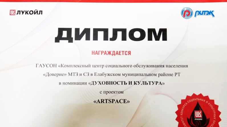 Елабужский КЦСОН «Доверие стал победителем 10 юбилейного конкурса социальных и культурных проектов ПАО «Лукойл» в Республике Татарстан в номинации «Духовность и культура» с социальным проектом «ART SPACE». Цель проекта: социальная адаптация детей с ограниченными возможностями здоровья посредством вовлечения семей в творческую и музыкальную деятельность. Средства гранта позволят создать на базе центра музыкальную комнату, где будет создана интерактивная среда оснащенная оборудованием: барабаны перкуссия, глюкофон, металлофоны и др. Родители, оставив своих детей на занятия, смогут заняться личными делами или посетят организованные для них арт-завтраки, сеансы живой музыки, познакомятся с новыми интересными людьми. Мероприятия проекта охватят 30 детей в возрасте от 5 до 15 лет и их родителей. Партнерами проекта являются МБУ «Детская музыкальная школа №1 им. Э. Бакирова», Добровольческий центр «Волонтер» г. Елабуга и др. В рамках творческого проекта дети смогут социализироваться в кругу сверстников, освоят новые знания, навыки. Все это, станет для семей альтернативой при воспитании и реабилитации детей, восполнит семейный ресурс.
