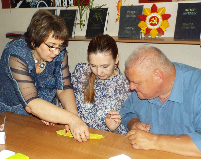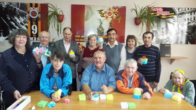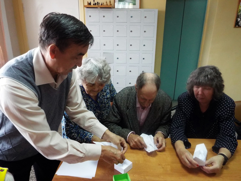 Пожилые люди складывали бумажные коробочки в технике «Модульное оригами», с заданием все справились на отлично. В подарок от преподавателей они получили подобные коробочки, сделанные учениками школы, но с секретом. Внутри каждой лежали различные бумажные цветы, выполненные в этой же технике.