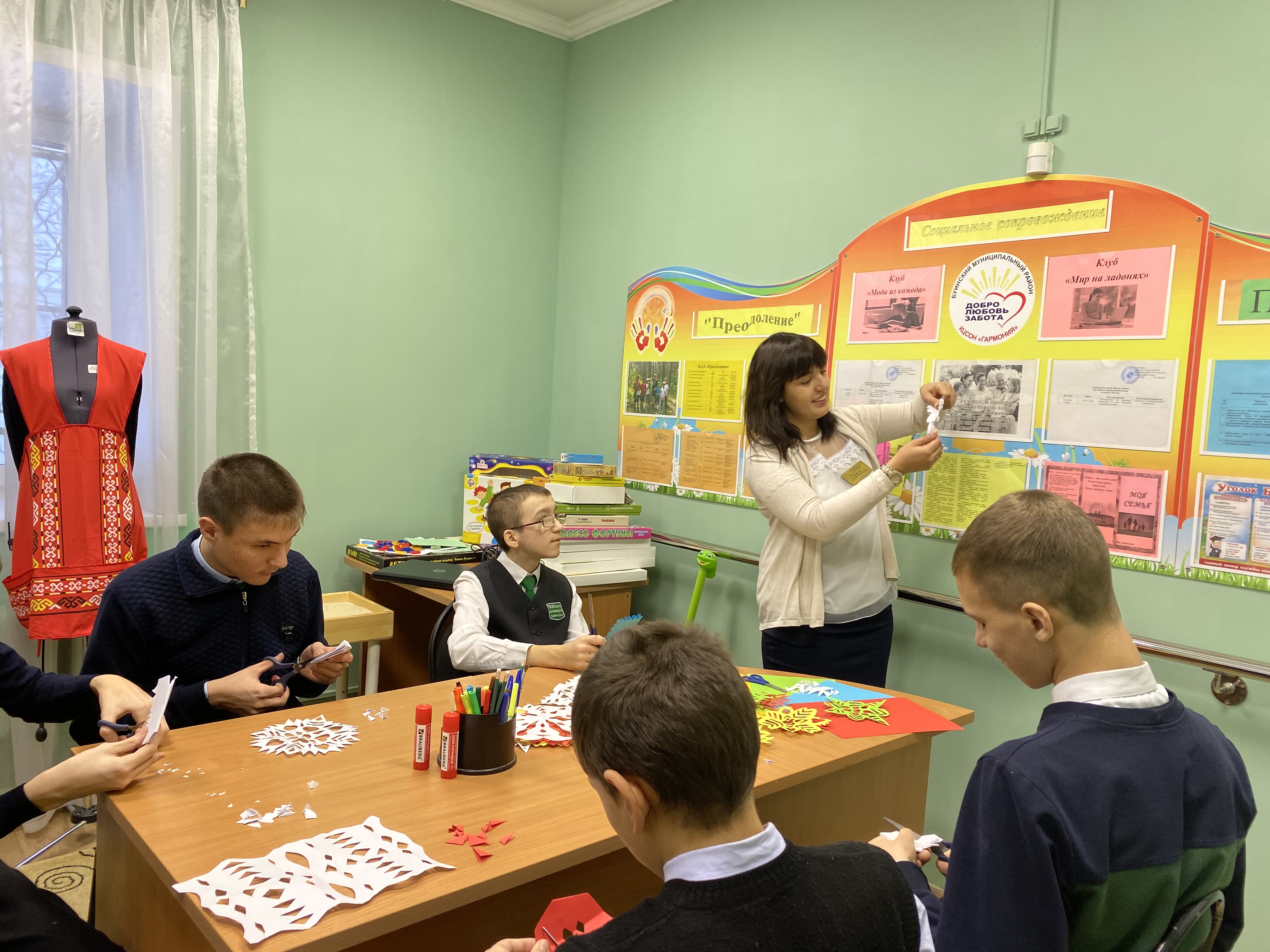 Такой творческий процесс обогащает внутренний мир у детей и развивает фантазию. Кроме творческого начала у них развивается усидчивость и навыки работы с бумагой. Следует отметить, что совместная работа по изготовлению новогодних снежинок с нашими подопечными в значительной степени сближает нас психологов с подростками.