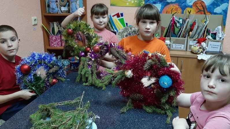19.12.2019г. инструктором по труду Давыдовой О.Н. проведено занятие c воспитанниками 9 – 11 лет на тему: «Новогодний венок»