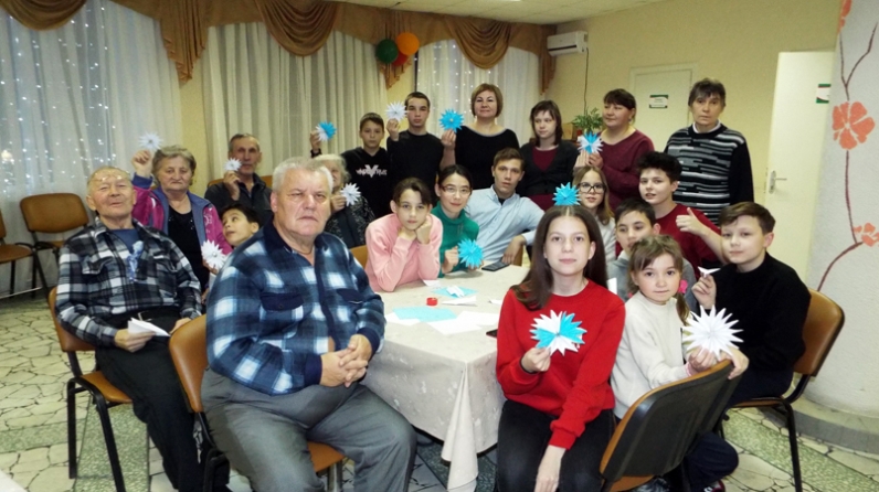 В преддверии Нового года очень приятно получать и дарить друг другу подарки. Пожилые люди подарили ребятам носочки и варежки, связанные своими руками, а ребята принесли в подарок коврик, который все вместе делали на мастер-классе в Детском доме в на День матери (оставалось только просушить его до конца).