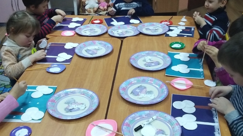 В начале занятия с детьми проводили беседу, отгадывали загадки, играли в игру «Зимние забавы». Во время творческой работы, дети не только делали аппликацию ну и научились доброжелательно общаться друг с другом, помогать товарищу.