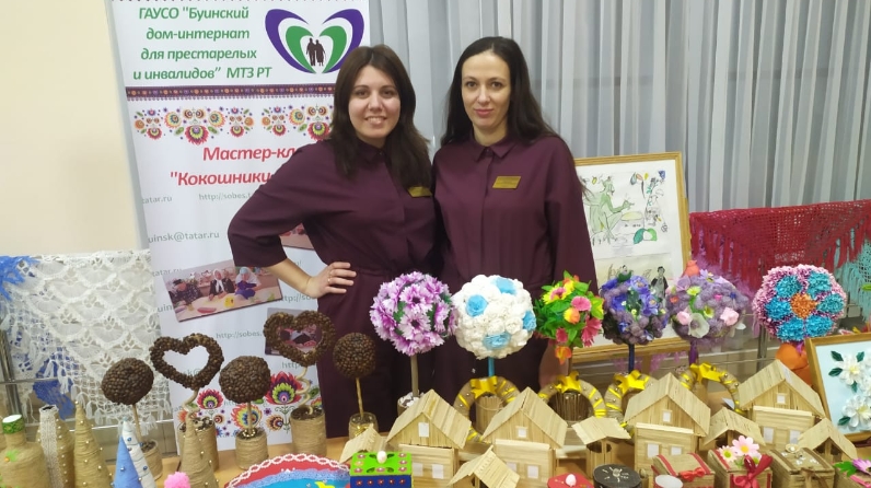 В здании дома культуры была организована выставка, на которой сотрудники Буинского дома-интерната демонстрировали поделки из бросового материала, изготовленные нашими получателями социальных услуг на занятиях по трудотерапии.