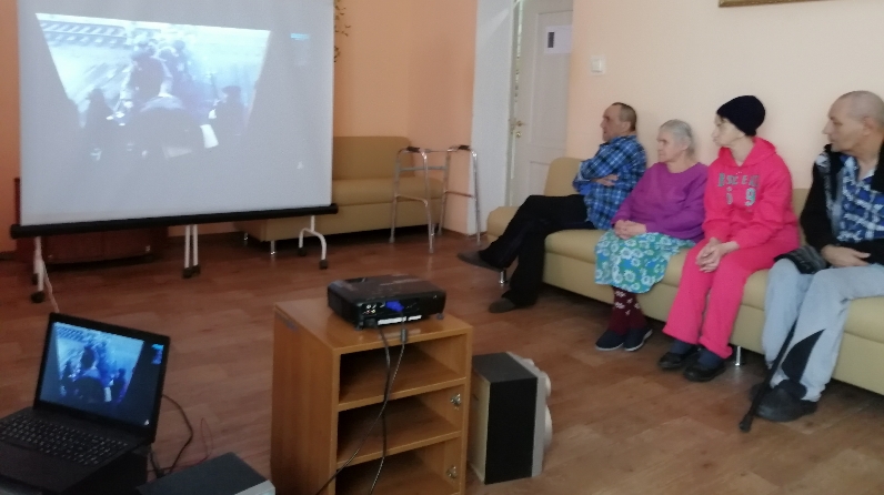 Цель: Сохранить память о подвиге ленинградцев-блокадников. Блокада Ленинграда - одна из самых трагических и печальных страниц в истории нашей страны. О мужестве блокадников слагались песни, снимались фильмы, написано много книг. Каждый день жизни в блокадном Ленинграде - это подвиг, который не меркнет в памяти поколений. Получателей социальных услуг с большим интересом посмотрели фильм «Коридор бессмертия», наглядно показывающий тяжелую жизнь ленинградцев в те нелегкие для всей страны времена.