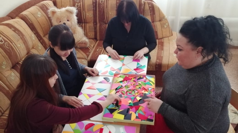 Занятие началось с упражнения «Здесь и сейчас». Участникам было предложено выразить свое состояние на момент начала работы в группе. Далее участникивыполнили упражнение «Страхи» и прошли тест «Самооценка психических состояний» для выявления уровня тревожности. Для снятия напряжения и коррекции эмоционального состоянияв конце занятия участники выполнили упражнение «Образ мира - Витражи» при помощи игровой техники «Мозартика».