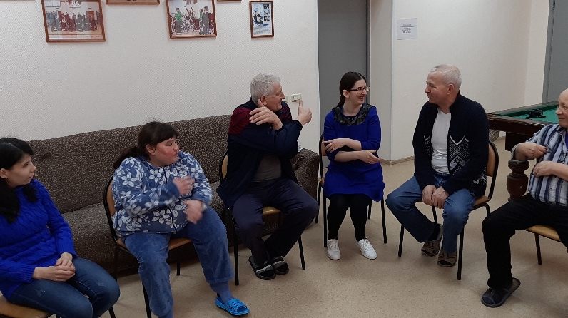 В начале тренинга с целью установления контакта и более глубокого знакомства с получателями социальных услуг проделали упражнения: «Качества личности», «Моя идентификация». Для развития навыков установления контакта с помощью невербальных средств, повышения уровня чувствительности в понимании другого проделали упражнения: «Изображение животного», «Общий признак», «Заключенные и тюремщики». В завершении участники поделились друг с другом положительным эмоциональным зарядом. При обсуждении участники высказались о влиянии таких занятий на формирование паттернов поведения.