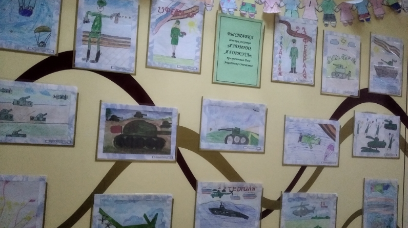 До объявления конкурса инструктор по труду провела с участниками беседу о том, что такое армия и кто такие защитники отечества, о разных видах войск, о военных профессиях. Затем ребята прослушали стихотворения, разгадывали загадки. В конкурсе рисунков на тему: «Я помню, я горжусь!» ребята изобразили героев рассказов о войне, советский танк и самолет, которые уверенно движутся навстречу Победе, солдата с винтовкой и т.п. - рисунки получились очень разные! Самые лучшие работы вывесили на общий стенд.