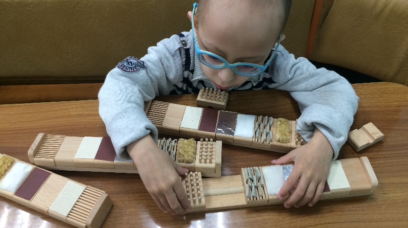Вот и сегодня на занятии в кабинете социально-бытовой адаптации дети дошкольного возраста ознакомились с различными играми и дидактическими пособиями: «Что в мешочке», «Тактильные фишки», «Тактильный лабиринт», бизиборды, бизикубы.