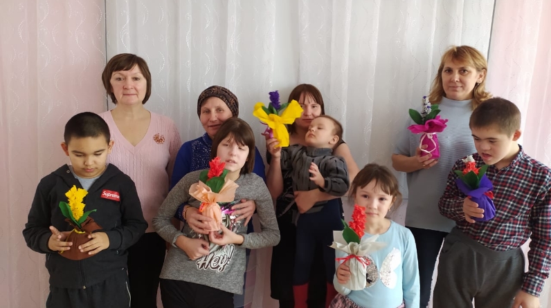 Затем она провела мастер-класс для получателей социальных услуг и их родителей по изготовлению сувенира для мам и бабушек. Воспитанники с большим желанием сделали гиацинт из гофрированной бумаги в подарок мамам.
