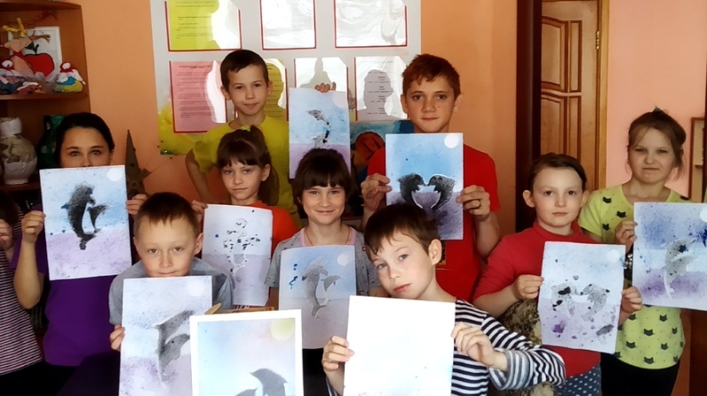 Ознакомившись с техникой «набрызг» в рисовании, ребята ознакомились с последовательностью выполнения работы «Дельфины». Ребята самостоятельно нарисовали изображение дельфинов и вырезали их. Затем с помощью трафаретов, зубной щетки, кисти гуаши последовательно выполняли творческие действия.