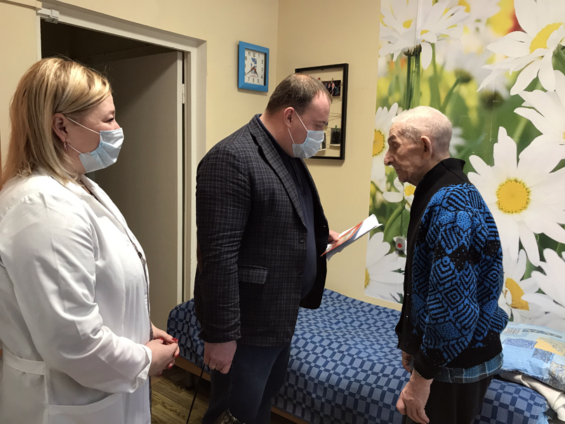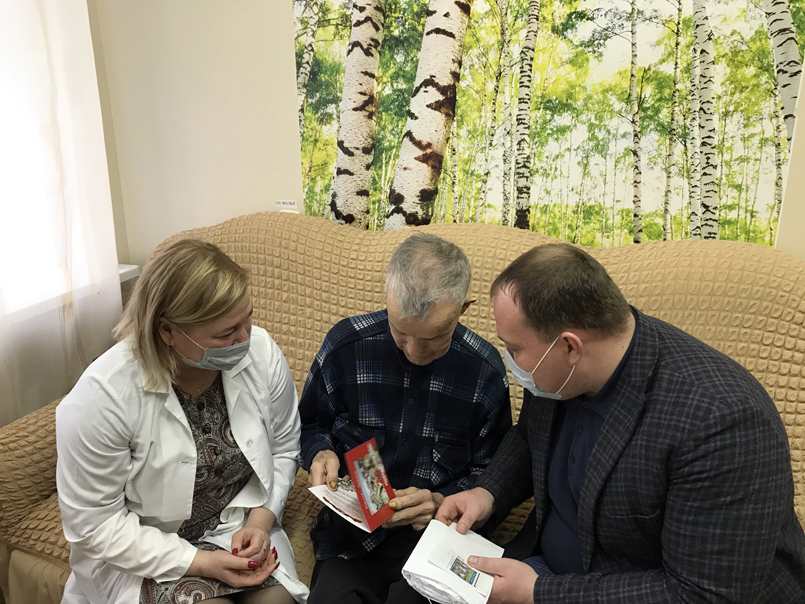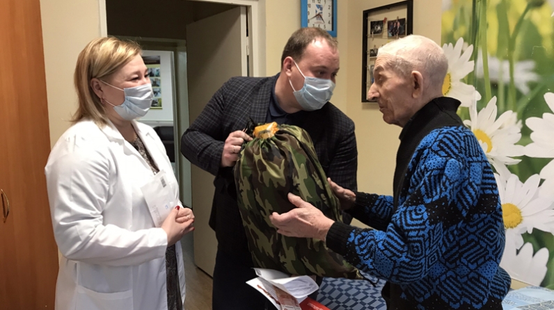 Директор дома-интерната Кирилл Мокшин и заместитель директора Александра Козловская поздравили с днем Победы и вручили праздничные подарки от руководителя Елабужского муниципального района участникам ВОВ, проживающих в доме-интернате - Рождаеву Серафиму Борисовичу и Абунаеву Хусаену Гайсиновичу.
