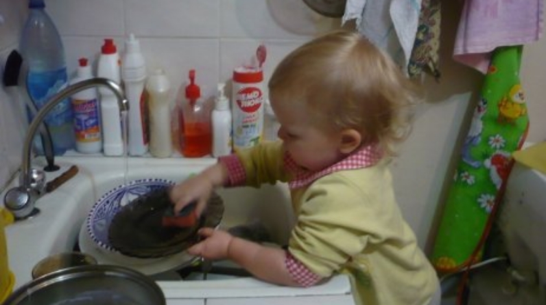С самого раннего возраста ребенок наблюдает за тем, как мама моет посуду, готовит завтрак, вытирает пыль. Труд ребенка дома должен начинаться с самых простых действий. Приучите его складывать свои игрушки в определенное место, поднять с пола упавшую игрушку или книжку. Малышу по силам вытереть пыль - сначала со своих игрушек, потом с доступного его росту поверхностей домашней мебели. Ребенок двух с половиной - трех лет уже может мыть посуду, вырезать фигурки из теста, подметать мелкий сор маленьким веничком или щеткой. Можно попросить малыша загрузить белье в стиральную машину, а потом помочь развесить его на сушилке.