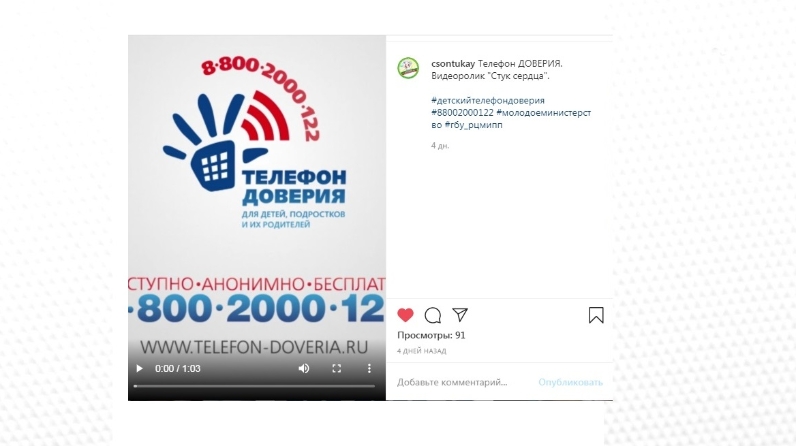 7 мая 2020 года в рамках реализации плана размещения рекламно-информационных материалов, направленных на популяризацию детского телефона доверия с единым общероссийским номером 8-800-2000-122 психологом отделения социальной помощи семье и детям Тукаевского комплексного центра социального обслуживания населения «Шафкать» Насыровой Лейсан был размещен видеоролик «Стук сердца» в аккаунте инстаграмм «csontukay». Видеоролик набрал 91 просмотр среди них 3 получателя услуг.