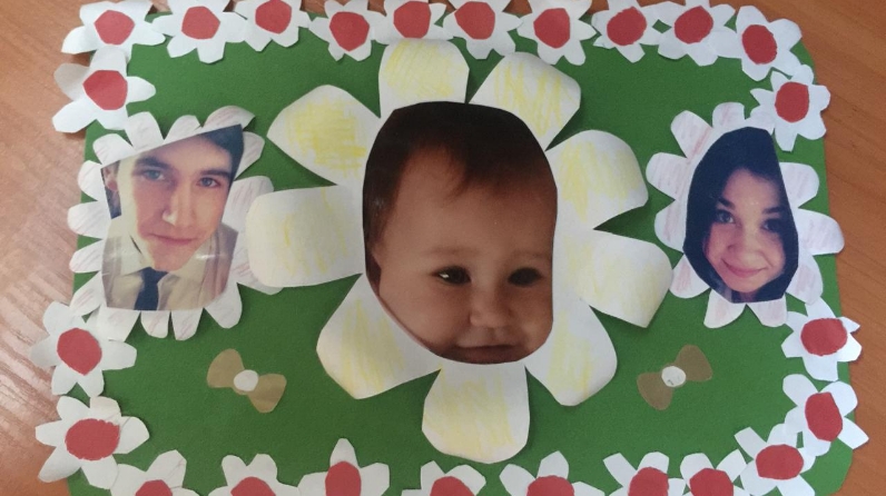 В начале встречи педагог поговорила с родителями о значении семьи для человека. Семья - это основа общества. Как большое здание состоит из миллионов кирпичиков, так и государство состоит из миллионов семей. Вдохновившись этой идеей, педагог предложила мамам и детям сделать поделку своими руками. Каждой семье необходимо было представить себя «поляной», а членов своей семьи «цветами» на этой полянке. Затем поставить свои фото в середину какого-либо цветка, вырезать его и приклеить его на зеленый фон-полянку. В процессе работы мамы вспоминали пословицы и поговорки о семье, разные смешные и интересные семейные истории. А с детьми педагог вспомнила слова, обозначающие членов семьи.