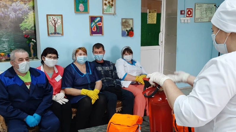 В связи с этим, в учреждении с сотрудниками заступившими на третью смену карантина под руководством старшей медицинской сестры Арслановой Д.М. и уполномоченной по ГО и ЧС Шиловой О.А. были проведены тренировки по отработке действий персонала при ЧС. Главной задачей учебной тренировки являлось обеспечение максимальной безопасности сотрудников и подопечных дома-интерната. Были отработаны: навыки использования СИЗ и огнетушителя, была проверена работа тревожной кнопки, отрабатывался порядок взаимодействия персонала учреждения между собой. Цели и задачи тренировок выполнены в полном объёме. Так же был проведён инструктаж действий при ООИ.