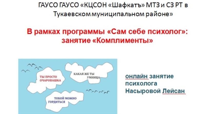 26 мая 2020 года психолог Лейсан Насырова провела дистанционно онлайн-занятие с получателями социальных услуг в рамках программы «Сам себе психолог» на тему: «Комплименты». Цель занятия: воспитание чуткого отношения к людям, чувство благодарности, вежливости, сформирование умения использовать комплименты в речи. Во время онлайн-занятия дети узнали главное правило комплимента – искреннее желание доставить человеку радость и положительные эмоции. Выявили в чем разница льстивых и лестных слов. Онлайн-занятие набрало 59 просмотров, среди них 4 получателя услуг.