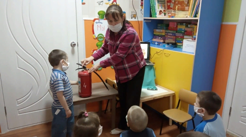 В ходе занятия познакомислись с устройстовом для тушения пожпра - огнетушителем. Дети узнали, что лучший помощник в первые минуты пожара до приезда профессиональных пожарных - огнетушитель. С большим интересом дети рассматривали огнетушитель и внимательно прислушивались к словам воспитателя. После практического занятия воспитанники посмотрели поучительный мультфильм "Кошкин дом". Воспитанники поняли, как важно всегда соблюдать правила пожарной безопасности.