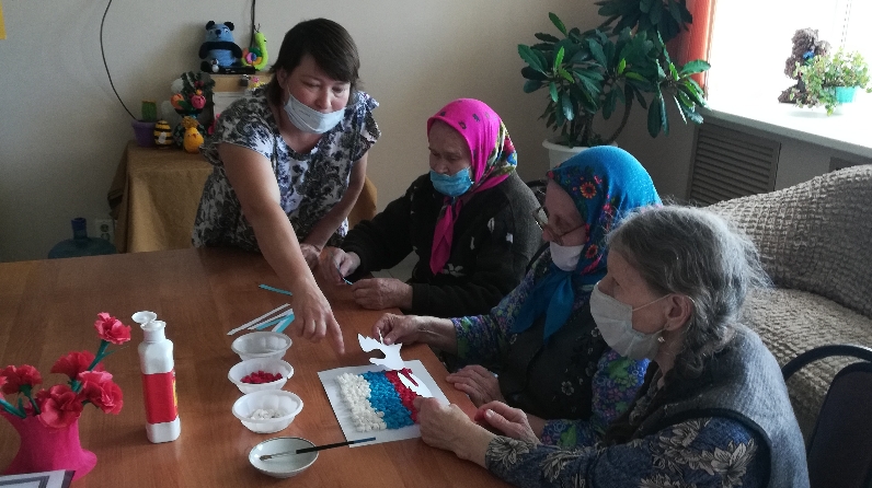 В ГАУСО «Тукаевский дом- интернат для престарелых и инвалидов» МТЗ и СЗ РТ с участием получателей социальных услуг прошло мероприятие , приуроченное ко Дню России «Коллективная аппликация «Символы России».Целью мероприятия стало популяризация государственных символов РФ, выполнение коллективной аппликации ко дню России, создание праздничного настроения, благоприятного психологического климата в коллективе. В ходе мероприятия подопечные отвечая на различные вопросы, вспомнили символы нашей Родины, показали свое мастерство. Получатели социальных услуг активно участвовали и получили удовольствие от выполненной работы.