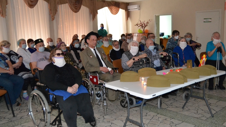 Проживающие с большим пониманием вместе с сотрудниками учреждения зажигали свечи памяти, расставляли пилотки, а затем в скорби почтили память павших в боях в ВОВ солдат минутой молчания.