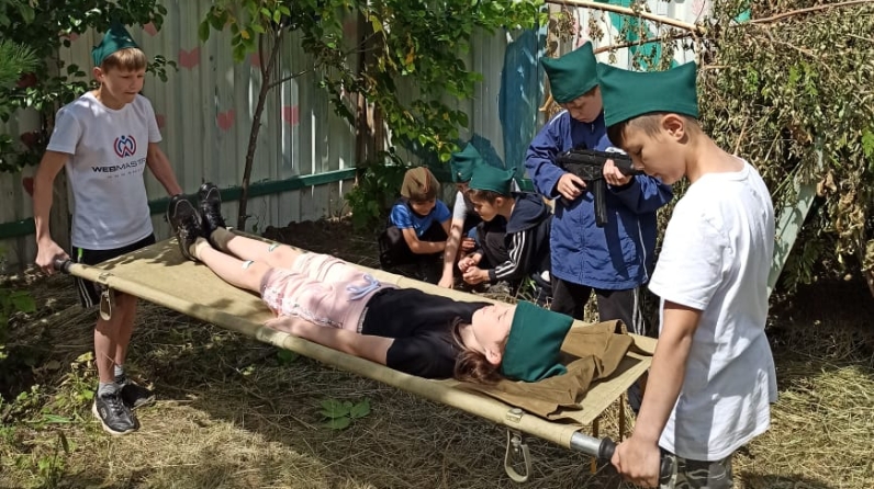 Продолжили изучение темы на прогулке. Дети построили шалаш, охраняли границу, оказали помощь раненому. Переместившись в былые времена, дети переполнились чувством гордости за своих сверстников, которые не жалея себя стояли на защите Родины.