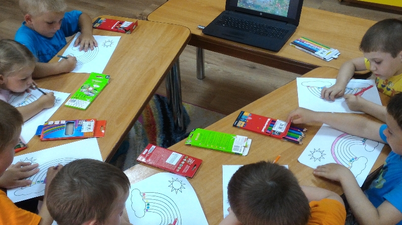 На занятии воспитанники вместе с героями мультфильма «Смешарики» отправились в увлекательное путешествие, где им повстречалось удивительное и красивое явление природы – радуга. Чтобы запомнить название и последовательность каждого цвета, дети помогали Крошу, Ежику, Лосяшу, Нюше, Барашу, Кар-Карычу, Копатычу собирать овощи, фрукты и ягоды определенных цветов. В конце путешествия ребята на листочках раскрасили радугу цветными карандашами.