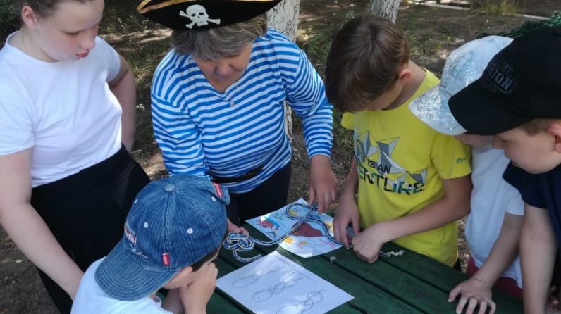 Вместе с пиратами юные путешественники последовательно двигались по этапам, решая различные задания. На первой станции «Боцман» было задание завязать морской узел по образцу, на второй «Верфь»- ребята конструировали корабль в технике оригами. Были станции, где воспитанники участвовали в эстафетах, конкурсах, отгадывали загадки. На станции «Дикое побережье» ребята познакомились с семафорной (флажковой) азбукой. А на станции «Камбуз» юные искатели должны были с закрытыми глазами определить на вкус название овощей и фруктов.