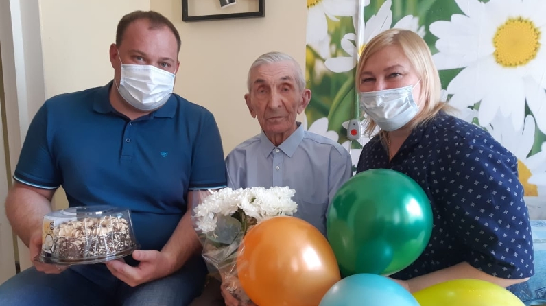 Директор интернате Кирилл Мокшин и заместитель директора Александра Козловская тепло поздравили ветерана с днем рождения и вручили ему сладкий подарок.