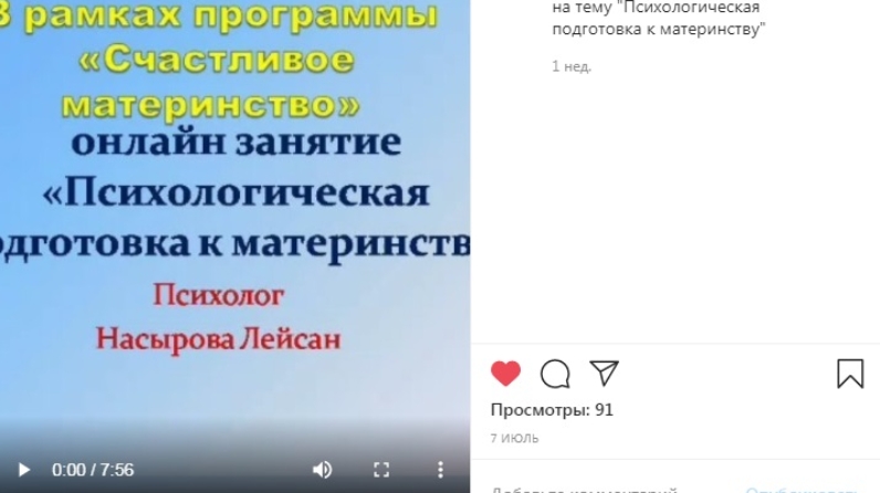 7 июля 2020 года в рамках реализации программы «Счастливое материнство» проведено онлайн-занятие в аккаунте инстаграмм «csontukay» психологом отделения социальной помощи семье и детям Тукаевского комплексного центра социального обслуживания населения «Шафкать» Лейсан Насыровой на тему: «Психологическая подготовка к материнству».