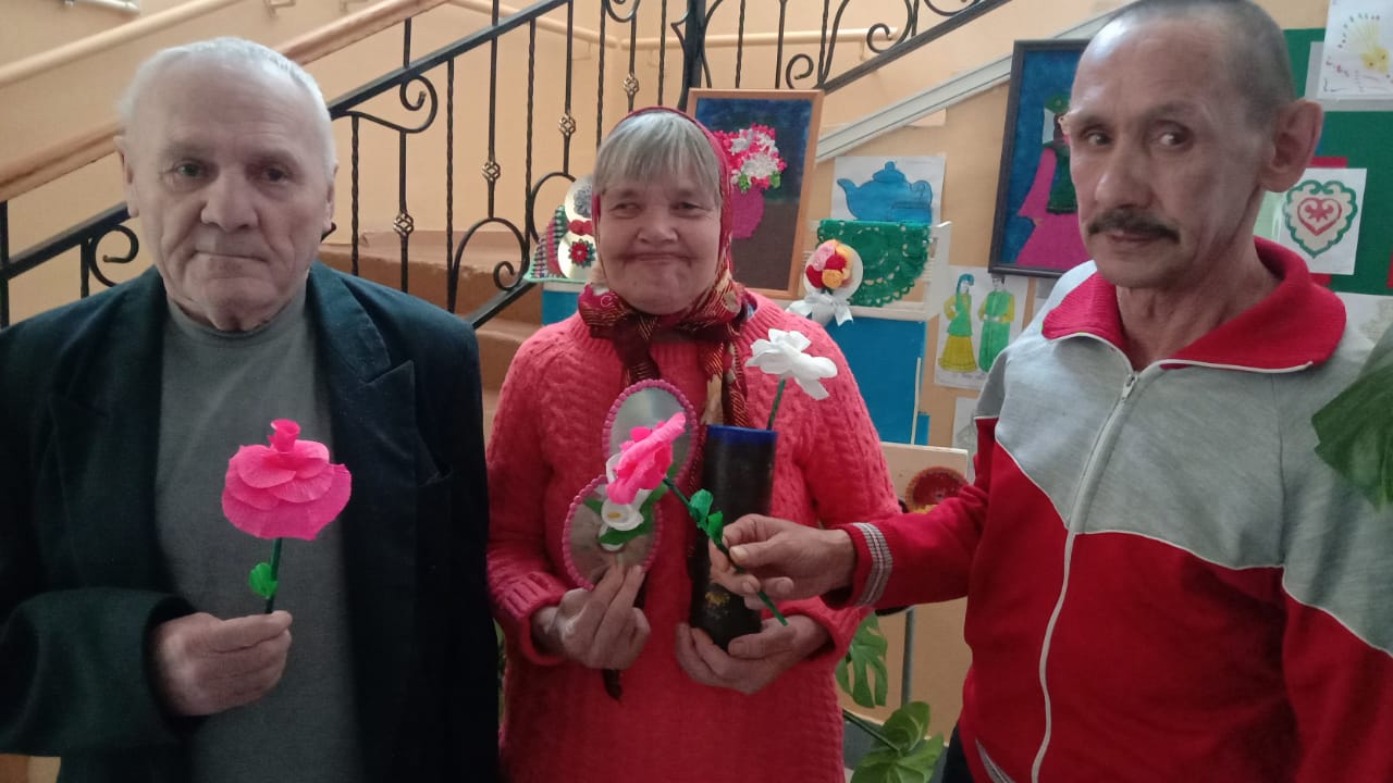 Занятие началось с обсуждения «Какие бывают цветы?», пожилым людям были показаны готовые композиции с цветами, сделанные из гофрированной бумаги, ватных дисков, пластилина, цветной бумаги, атласных лент. Затем инструктор по труду показала, как делать розу из гофрированной бумаги, каллы из ватных дисков и палочек, тюльпаны из пластилина, подснежники из атласных лент, примулу из комочков цветной бумаги, медуницу из пуговиц. Далее получатели социальных услуг приступили к самостоятельной деятельности. В заключении была оформлена выставка «Цветы на 8 марта.»