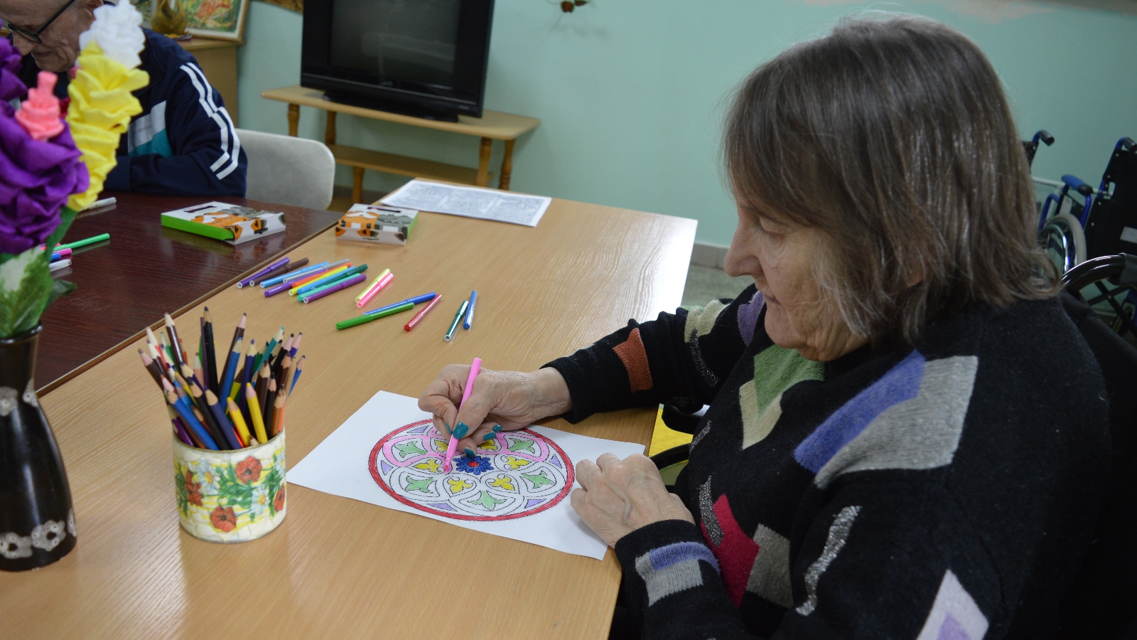 Прежде чем оформить свои рисунки проживающие познакомились с понятием народный орнамент. Поскольку Россия – многонациональное государство, и на его территории проживает более 190 народов, имеющих свой язык, традиции, культуру. И у каждого народа есть свой узнаваемый орнамент. Орнамент – это самый древний язык наших предков, с помощью которого они общались друг с другом, пока не было письменности.