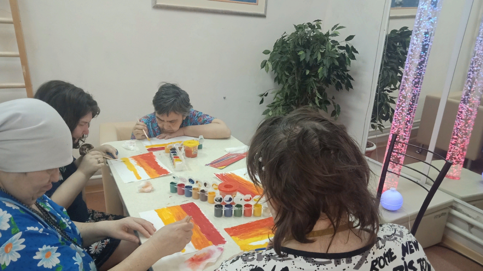 Арт-терапия является щадящим, но эффективным способом борьбы со стрессами, накопившимися проблемами, душевными переживаниями. Занятия интуитивной живописью позволяют получателям социальных услуг получить удовольствие от процесса, улучшить настроение, зарядится позитивом. Этому способствует и создание соответствующей атмосферы с помощью прослушивания музыкальных композиций, ароматерапии и соляной лампы.
