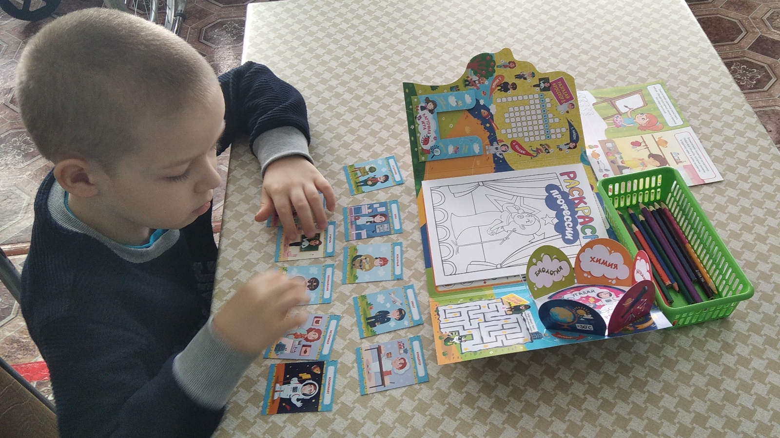 Поэтому центральное место в нашей работе отводится игре. Например, красочная интерактивная папка, внутри которой 10 самых интересных заданий для детей: “Раскраска”, “Набор карточек”, “Лабиринт”, “Конверт-цветок”, “Кто с чем работает”, “Найди лишнее”, “Посмотри и ответь”, “Кроссворд” используется для индивидуальной работы. Она позволяет конкретизировать и расширять представления детей о разнообразной деятельности взрослых, их взаимоотношениях с другими людьми, о профессиях, используемых орудиях труда.