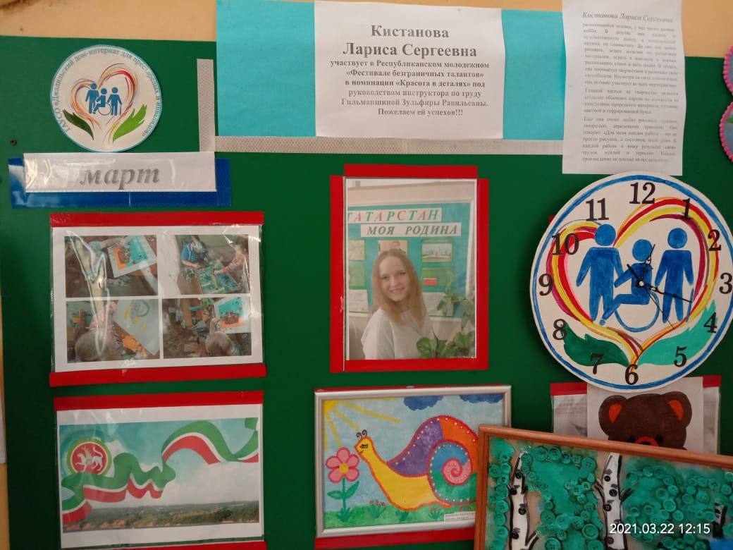 Жительница ГАУСО «Джалильский дом-интернат для престарелых и инвалидов» Кистанова Лариса под руководством инструктора по труду Гильманшиной Зульфиры Равильевны приняла участие в «Фестивале безграничных талантов» в номинации «Красота в деталях».