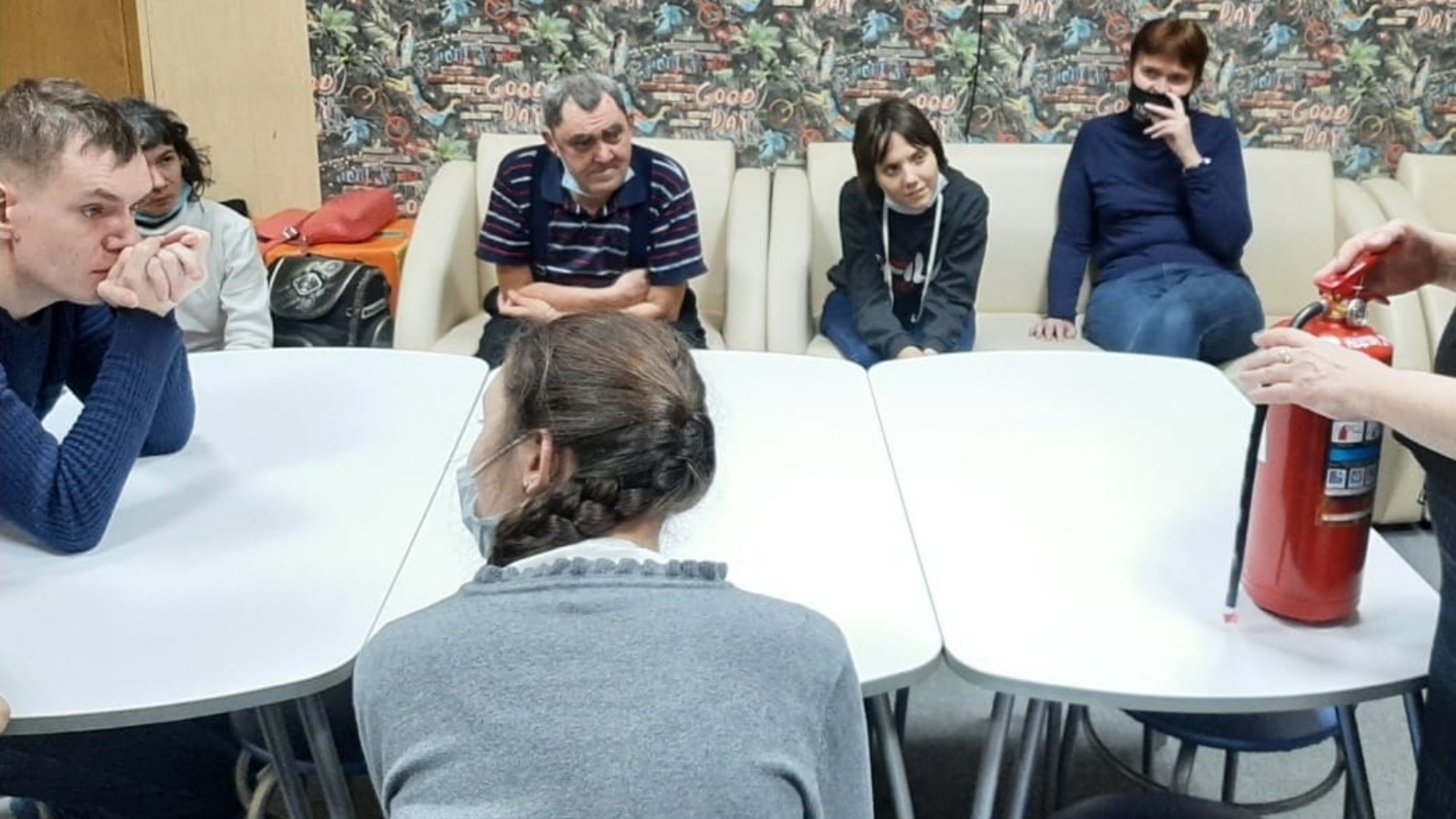 Во время практической части занятия специалисты совместно с получателями социальных услуг отработали шаги в условиях возникновения импровизированного пожара и прошли маршрут к эвакуационному выходу.