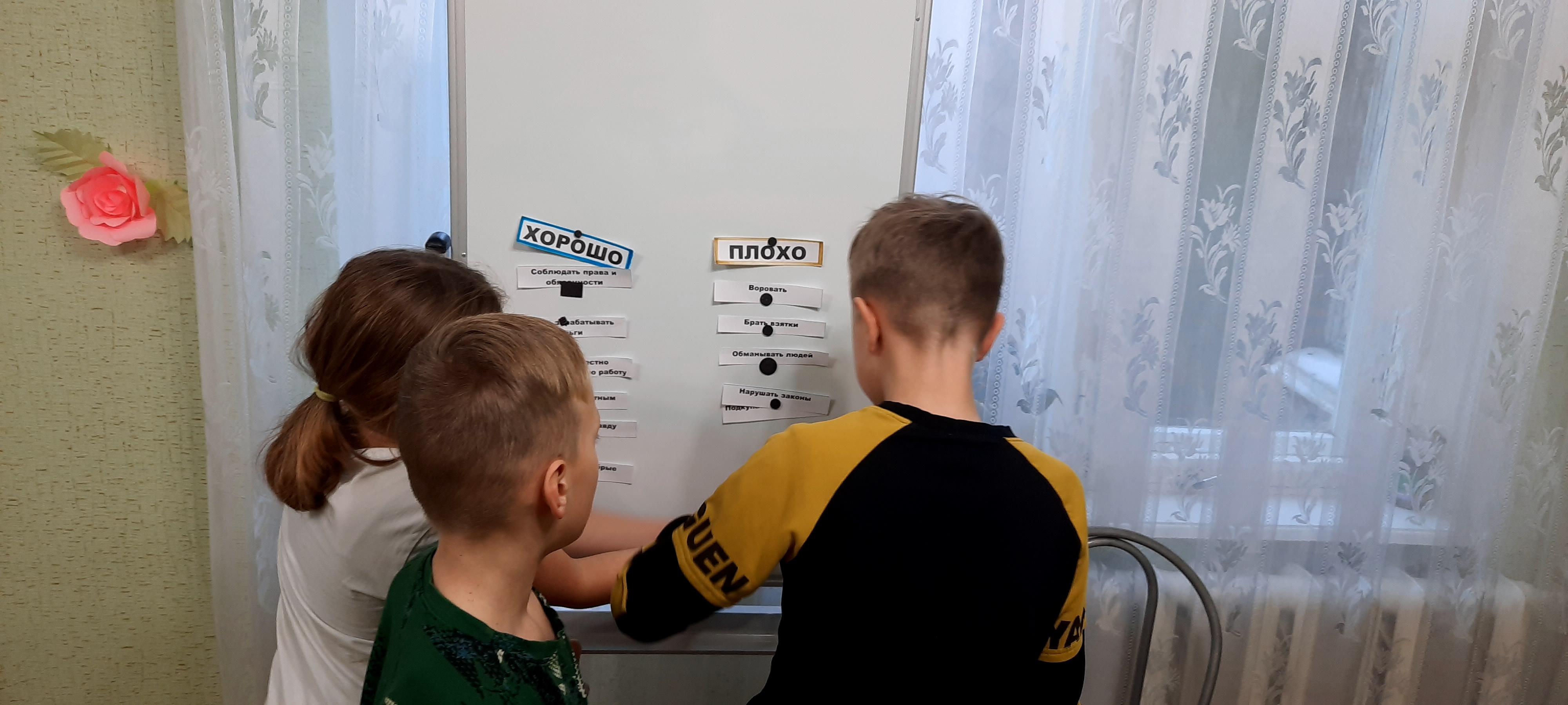 В рамках курса занятий «Основы правовых знаний» специалист Дилара Борисова провела групповое занятие на тему: «Правовая ответственность несовершеннолетнего». Занятие было проведено с целью формирования навыков саморегуляции, знакомства с правовой ответственностью несовершеннолетних. Присутствовали на занятии 10 несовершеннолетних детей. Занятие началось с обсуждения о том, что происходило с ними в последние дни: что было хорошего, а что плохого и почему. В упражнении «Наши эмоции – наши поступки» участникам было предложено продолжить предложения, а затем обсудить, о чем они думают, когда совершают тот или иной поступок. Вместе с ребятами рассуждали и о том, что нужно сделать, чтобы вовремя остановиться перед совершением необдуманного действия. После чего участники ответили на вопрос - с какого возраста и за какие правонарушения несовершеннолетний привлекается к ответственности? В конце занятия участники поделились впечатлениями о занятии