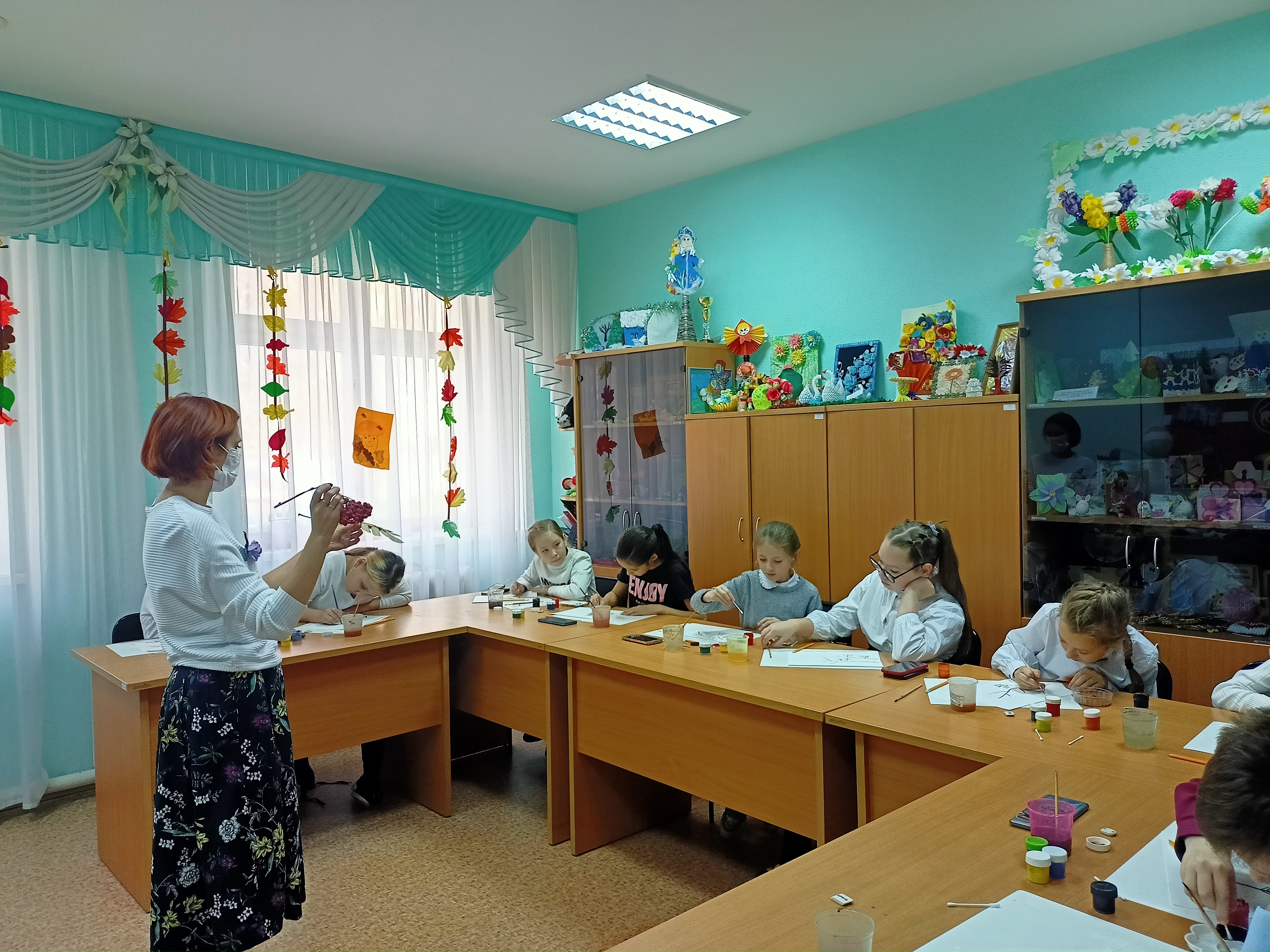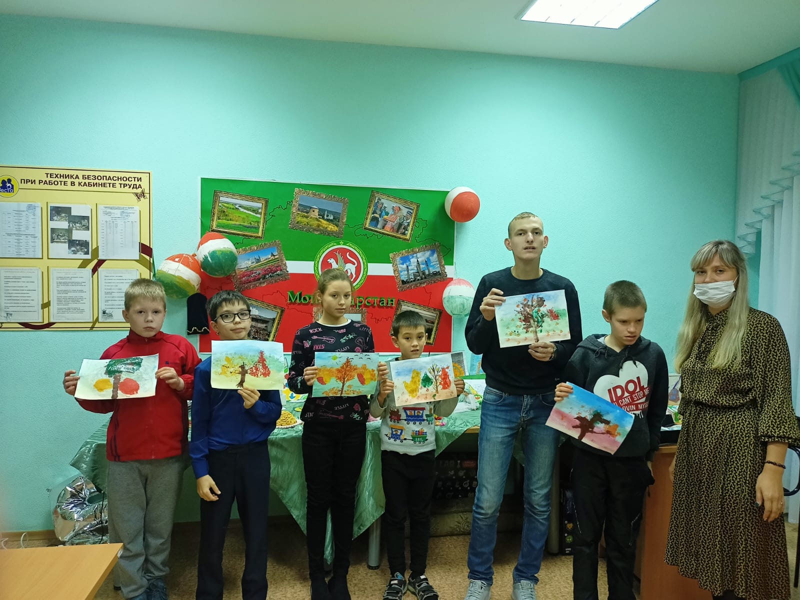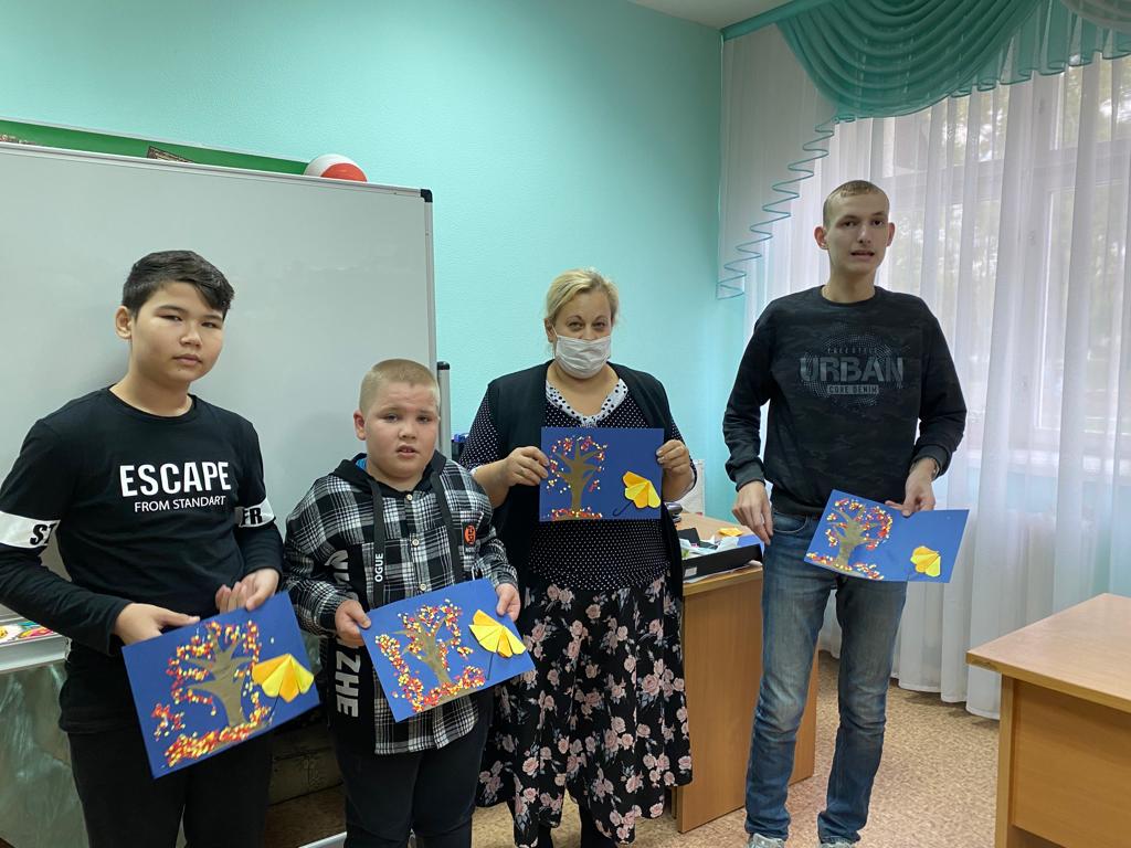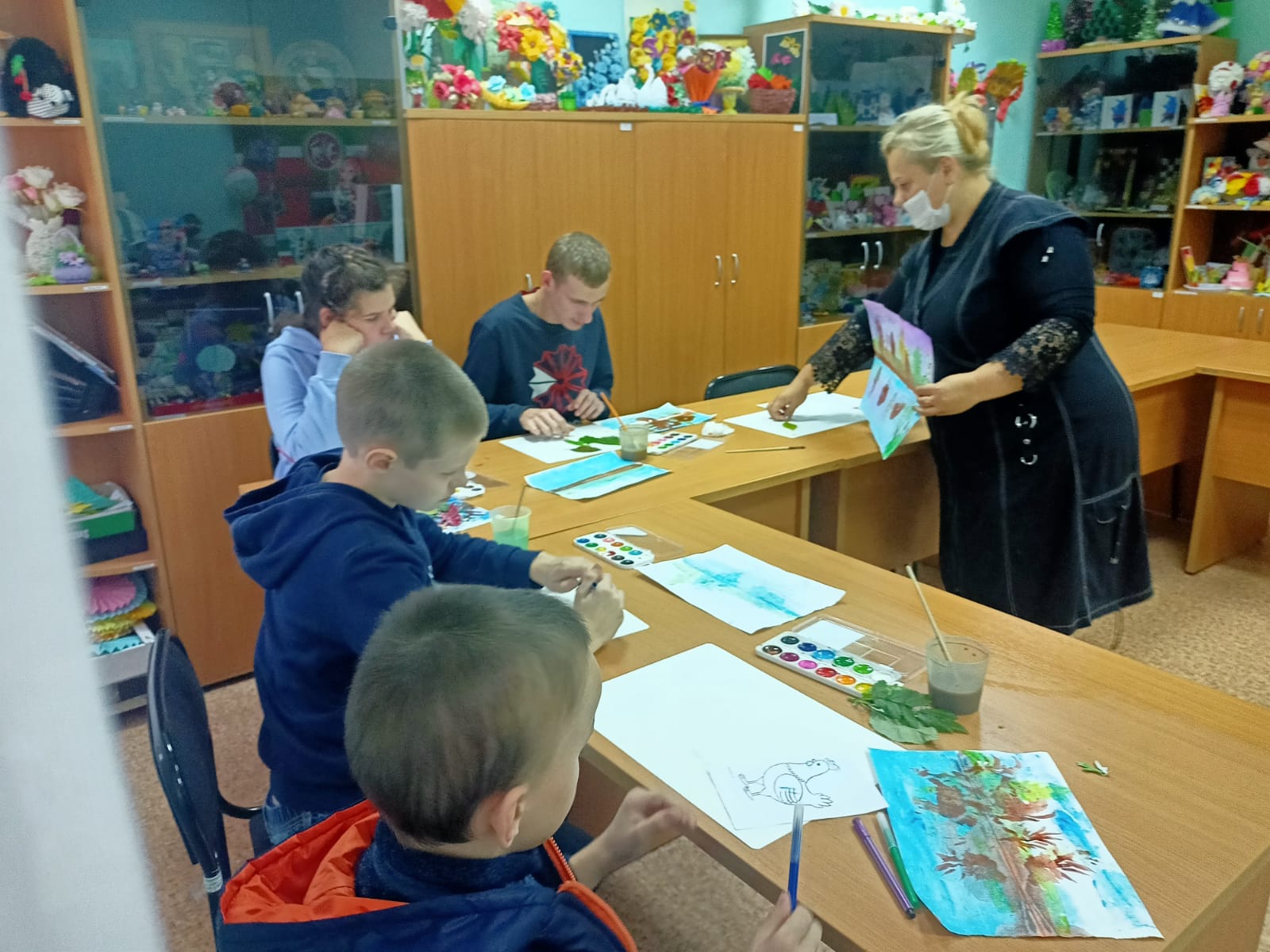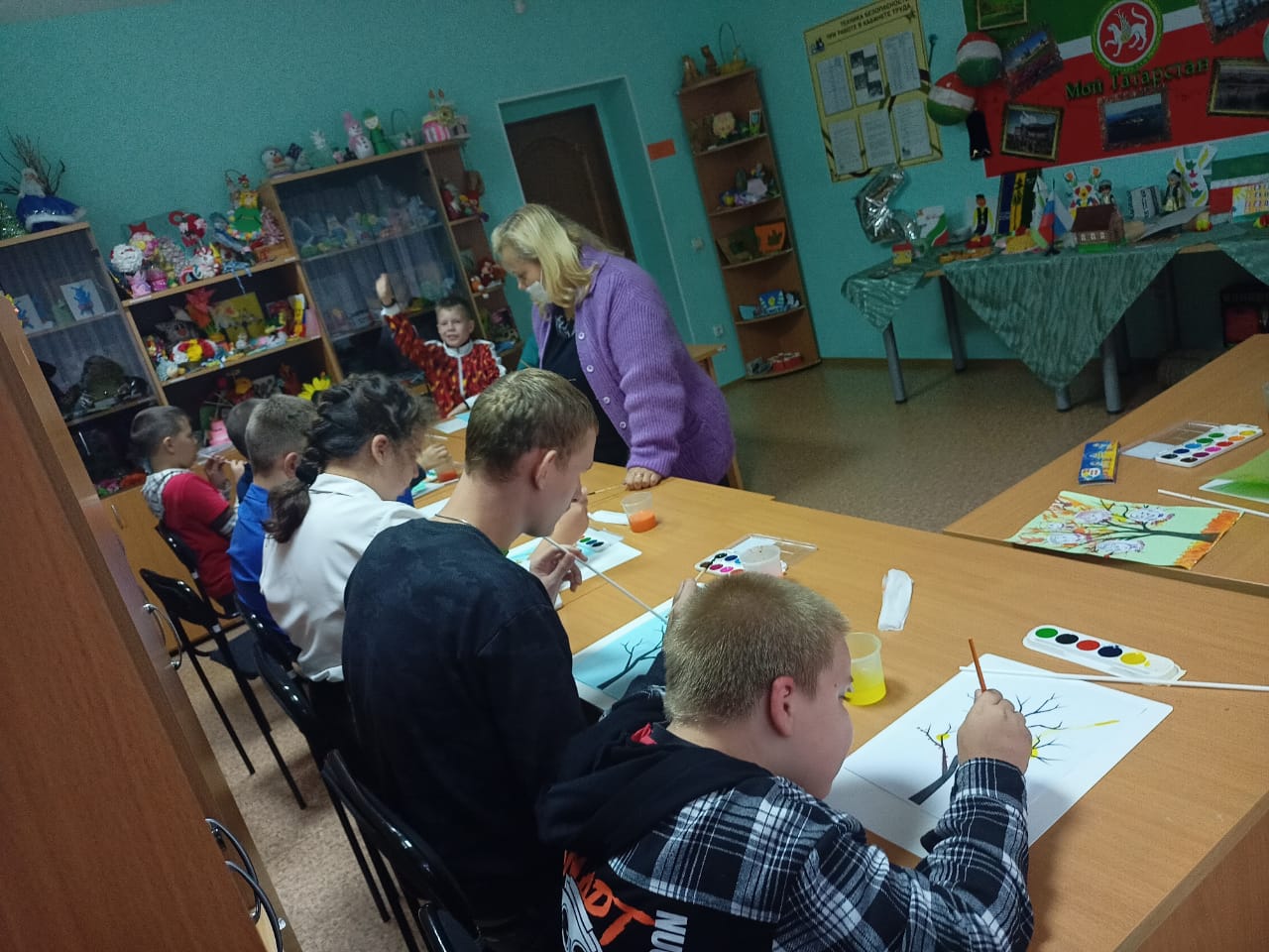 В рамках программы «Мир творчества» инструктор по труду Нижнекамского центра социальной помощи семье и детям «Веста» Елена Вагурова 21 сентября провела групповое занятие на тему: «Мой край родной». Занятие началось с прочтения стихотворения про осень, отгадывания загадок, рассматривания иллюстраций осеннего леса родных мест, явлений природы: листопад, дождь, поведение животных и птиц. После этого ребятам было предложено нарисовать родной край в осенних красках с помощью техники «монотипия». Сначала участники внимательно изучили новый метод, а затем с удовольствием взялись за дело: лист бумаги вначале сложили пополам по горизонтали, затем опять развернули, красками или гуашью нанесли на одну половину листа осенний пейзаж (с помощью отпечатков листьев дети создавали интересную фактуру изображения деревьев). После чего лист снова сложили, аккуратно прогладили и на второй половине листа получалось как бы зеркальное изображение. После получения оттиска, исходный рисунок оживили красками повторно, чтобы он имел более чёткие контуры, чем его отражение на второй половине, изображающую водную гладь водоёма. Дети активно работали и остались очень довольны своими рисунками, так как занятия с необычными техниками рисования им очень нравятся. Мероприятие было проведено с целью воспитания любви к своей малой родине; закрепления навыков и умения по созданию композиций природы; развития чувства цвета, воображения, творческих возможностей, аккуратности, активности, умения работать в коллективе. Присутствовали на занятии 4 несовершеннолетних ребенка, состоящих на социальном обслуживании